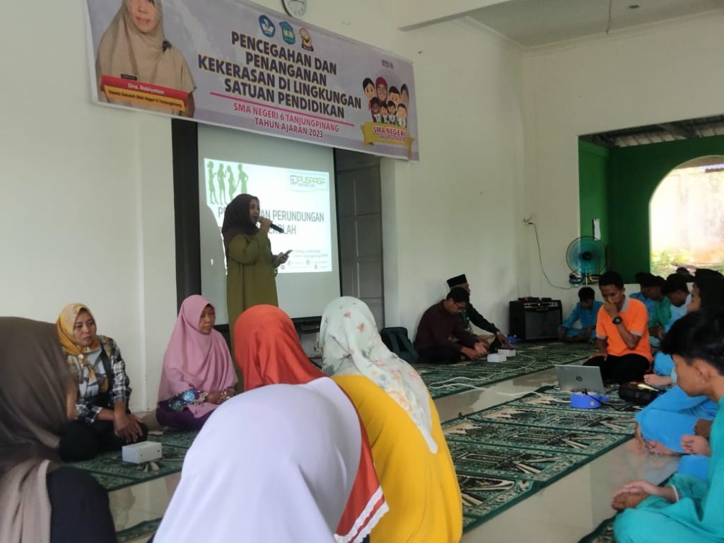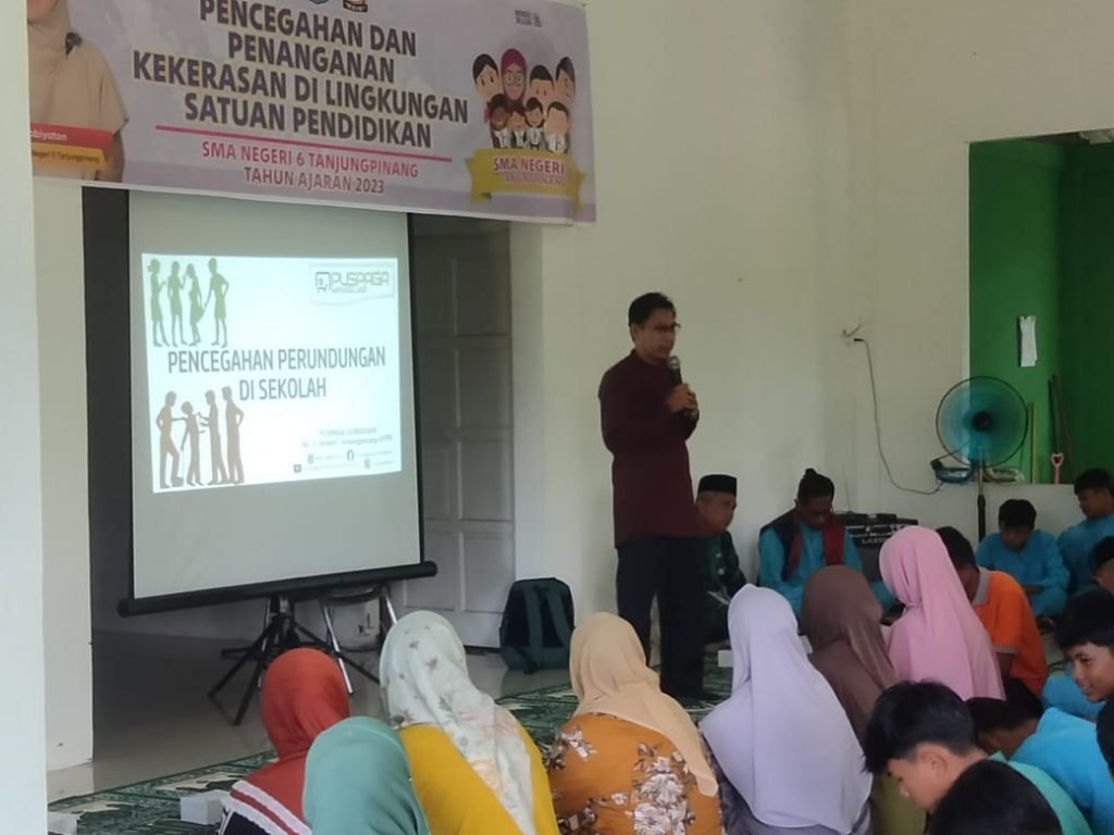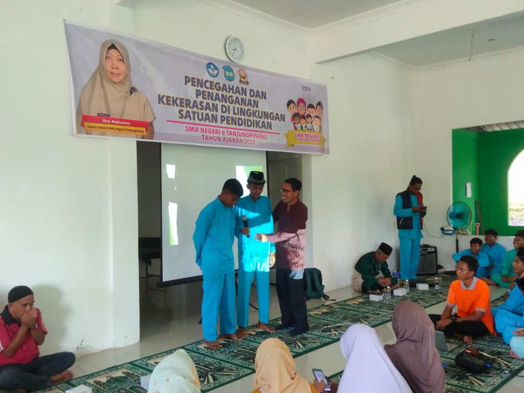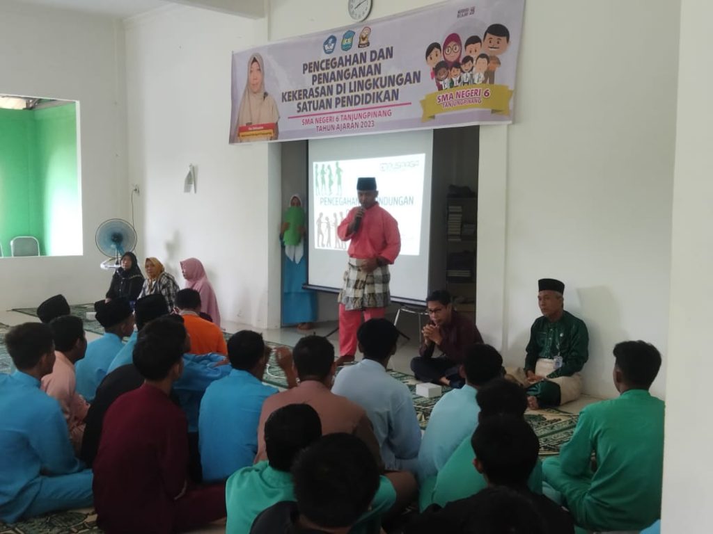 Senggarang, SMANSix_ Didampingi oleh guru, wali kelas, dan Tim PPK (Pencegahan dan Penanganan Kekerasan) SMA Negeri 6 Tanjungpinang, seluruh siswa SMA Negeri 6 Tanjungpinang mengikuti sosialisasi Pencegahan dan Penanganan Kekerasan di Lingkungan Satuan Pendidikan pada pagi Jumat, 17 November 2023, dengan narasumber Sudirman Narsum Latief, anggota Puspaga (Pusat Pembelajaran Keluarga) Gurindam, Kepri. Kegiatan yang berlangsung di Masjid Al Azzam ini dilaksanakan sesudah kegiatan Rohis dan dihadiri oleh perwakilan dari orang tua siswa, masing-masing dari kelas X, kelas XI, dan kelas XII.